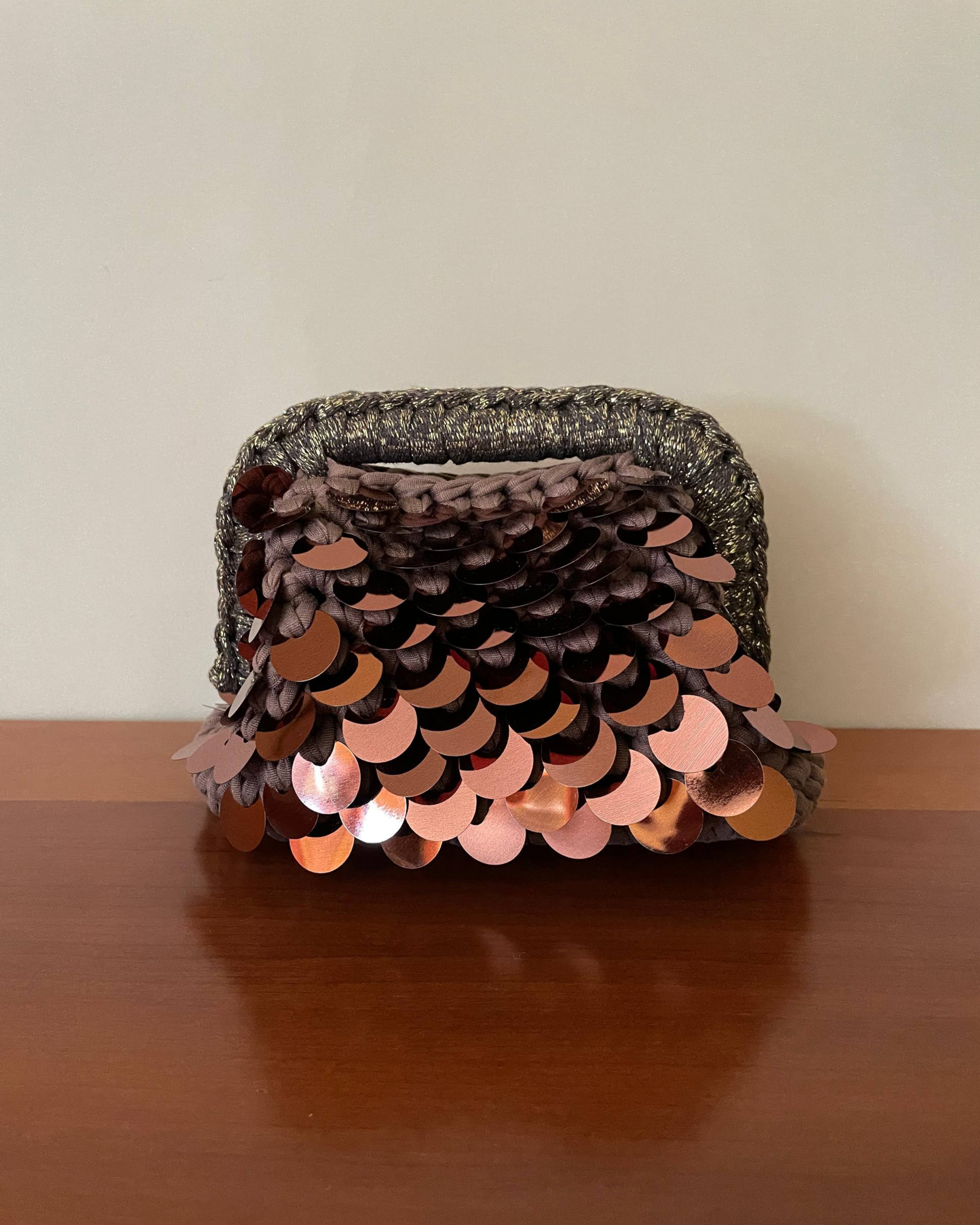 Borsa crochet handmade marrone con paillettes bronzo. Un accessorio artigianale luminoso e raffinato, perfetto per impreziosire ogni look.