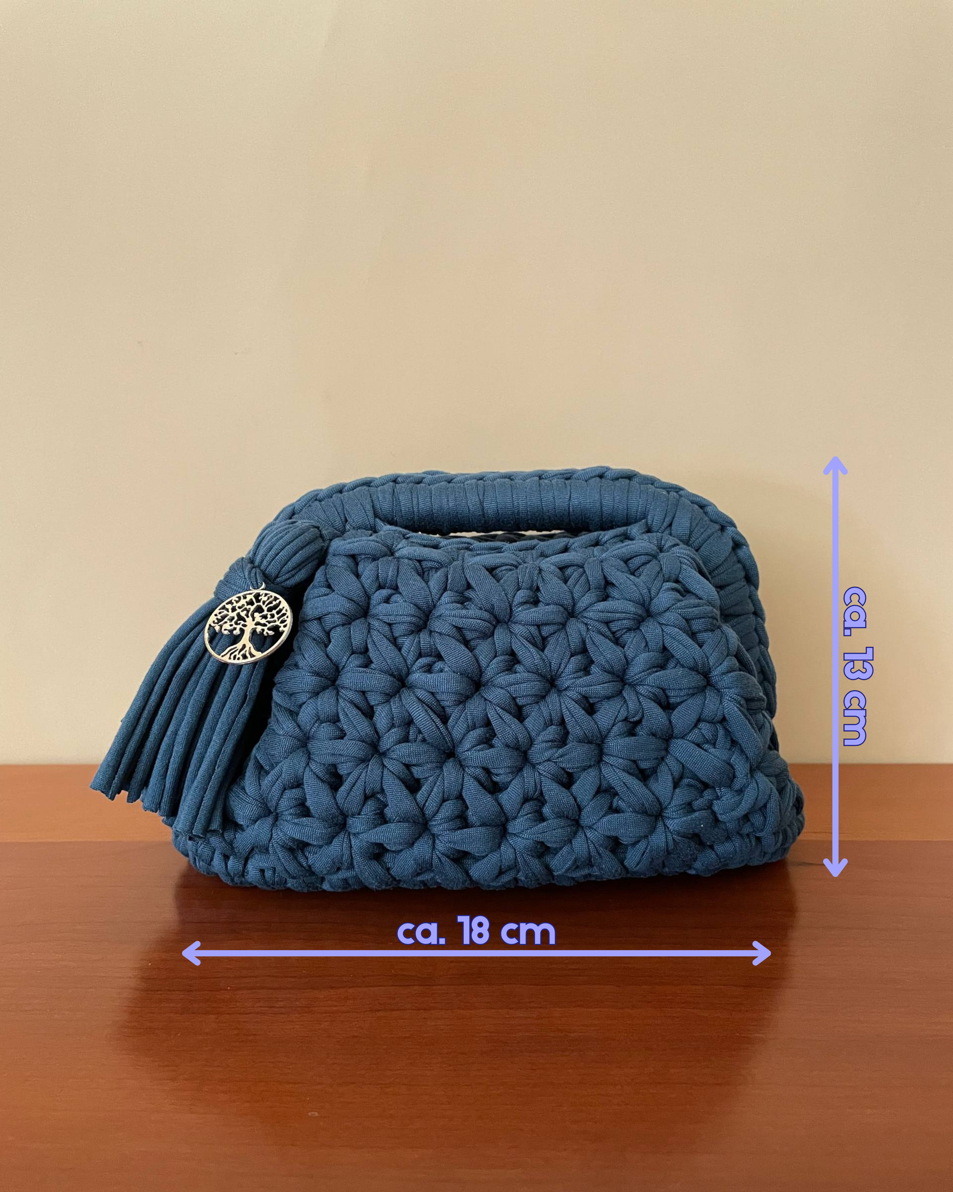 Borsa crochet handmade ottanio con nappina laterale ottanio e ciondolo decorativo. Un intreccio artigianale che unisce semplicità ed eleganza senza tempo.