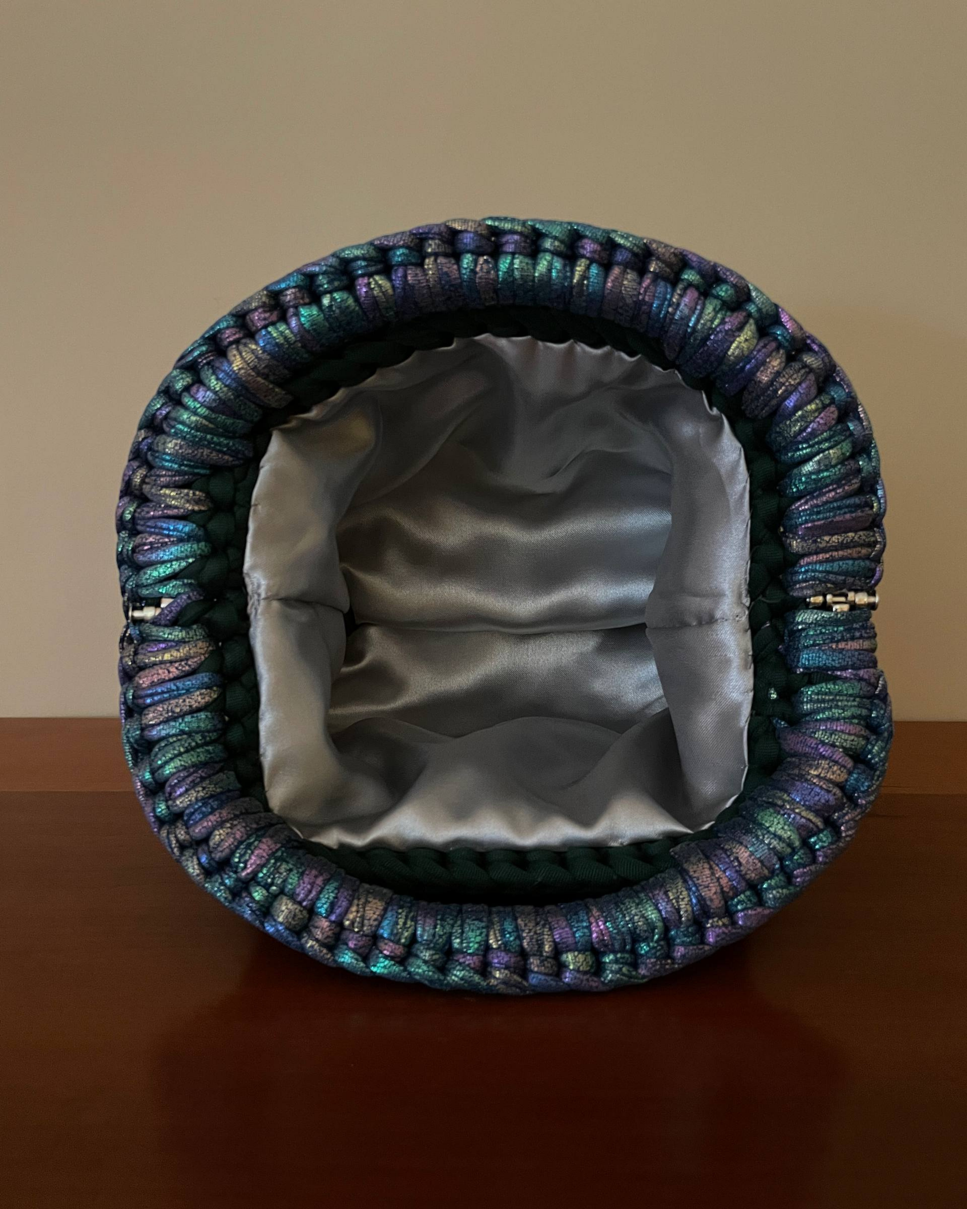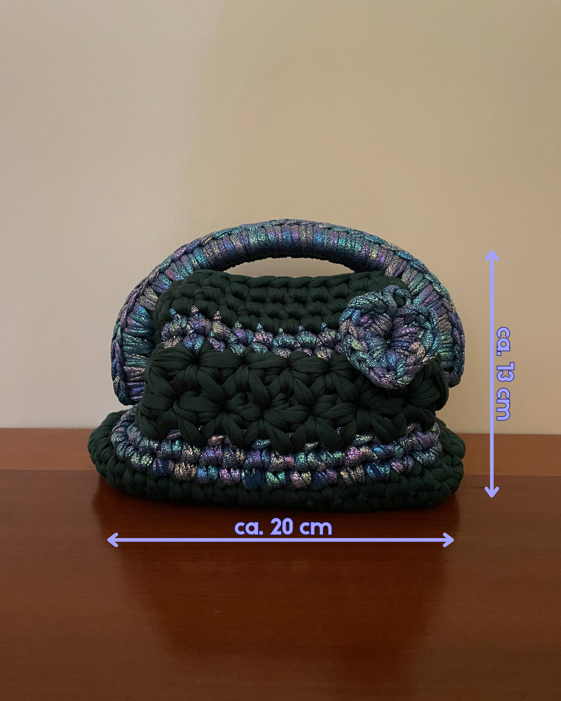 Borsa crochet handmade verde bottiglia foderata con inserti multicolore. Un accessorio artigianale unico, arricchito da manico multicolore per un tocco vivace ed elegante.